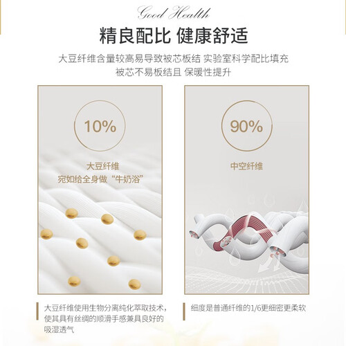 采用蓬松的大豆纤维填充,质地柔软有弹性,舒适亲肤满足睡眠所需。同时配备了贴心的固定环带,可让被面更加平整预防走位。