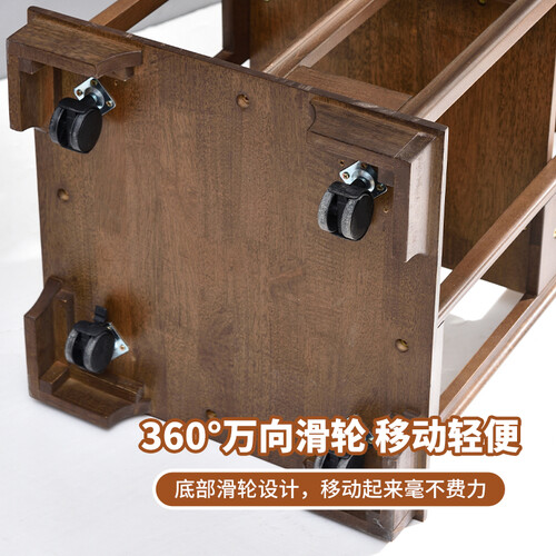 实木材质制作,质地比较坚硬,具有很强的承重能力,使用寿命会更持久。结合滚轮设计元素,方便日常进行移动。