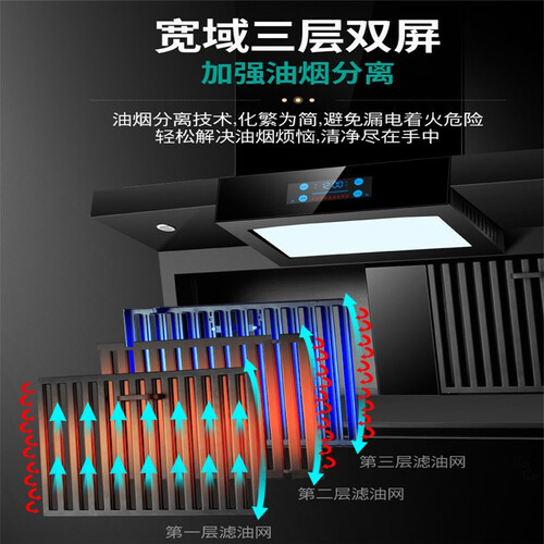 7字型设计的烟机,从源头分离油渍,延长机体使用寿命。结合变频强排大风压,无惧烹饪高峰期,油烟不倒灌。