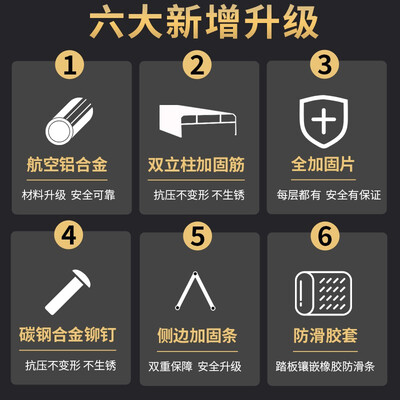 精选碳钢合金材质的铆钉,有效加固,抗压不变形。采用加强钢条设计,可以保持梯子的稳固性,不断裂破损。