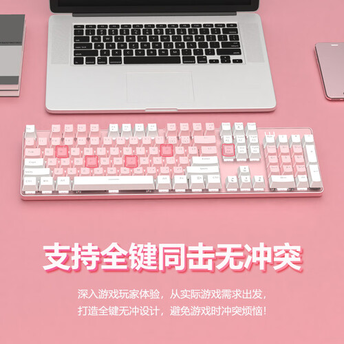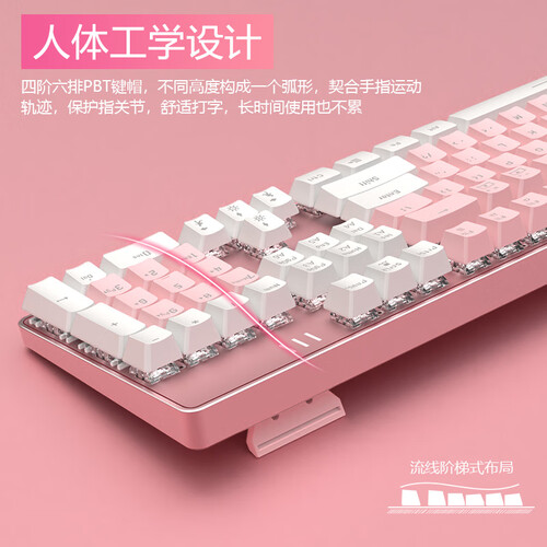 绚丽双拼设计的键盘,相较于传统单色系,更显活力时尚。采用双拼色彩,粉白的少女配色十分清新,满足少女心。