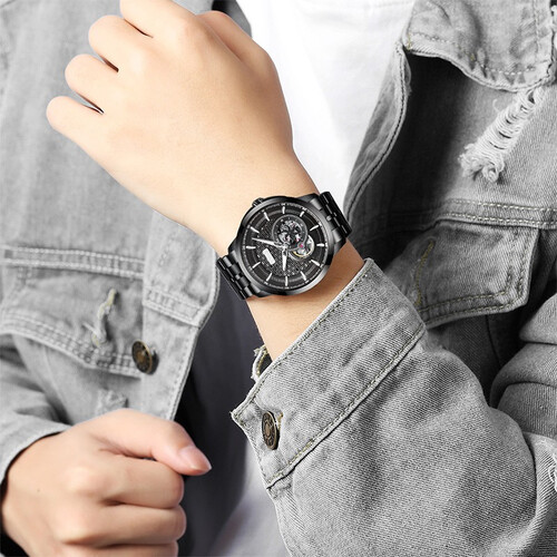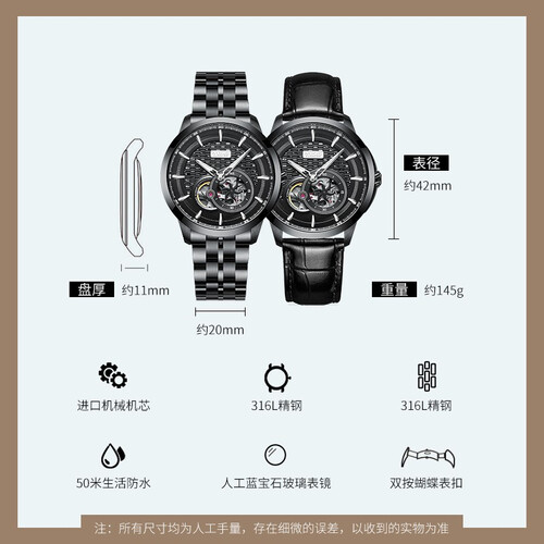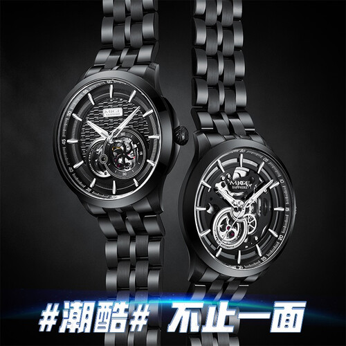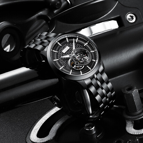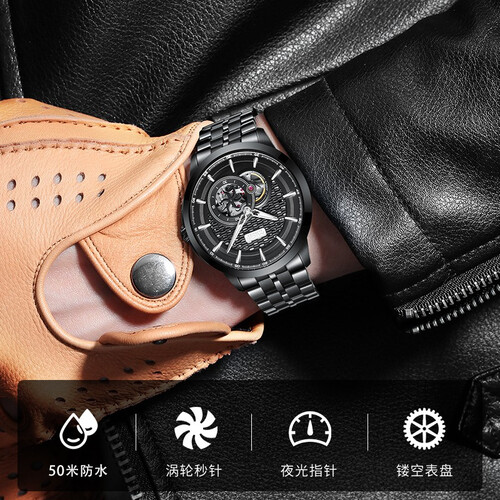PVD镀黑精钢材质,沉稳利落尽显商务风范,伴你出行多种重要场合。加厚蓝宝石表镜,坚硬剔透无惧磨损剐蹭。