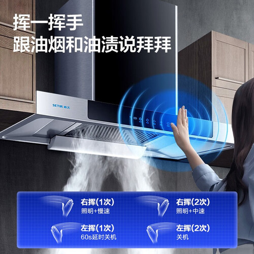 30S增压速排性能,可一键快速排烟,轻松应对爆炒烹饪需求。双层错位设计的加厚不锈钢滤油网,快速滤油的同时也方便清洁。