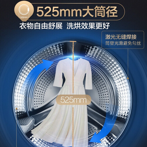 采用525mm大筒径设计,减少烘干褶皱,衣物轻松伸展。具有智能投放功能,告别多次投放烦恼,洗衣液量控制刚刚好。