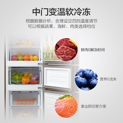 面板配色采用经典的金色,时尚大方,轻松融入不同的厨房风格。设计中门变温区,可以自由调节温度,家庭保鲜无压力。