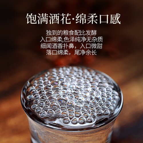 采用古法踩曲工艺酿制,更利于酒曲的发酵,香气浓郁,微生物含量更多。该白酒芬芳细腻,口感醇厚,饮后让人回味悠长。
