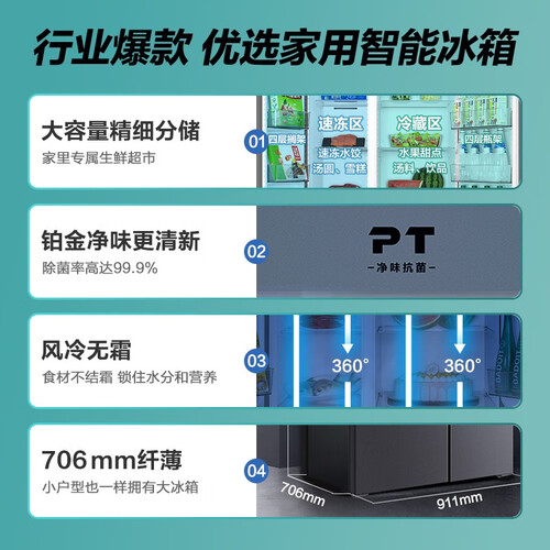采用双变频养鲜功能,能有效抚平冰箱温度,稳控运行守护食材鲜美。净味分子可以吸附异味,安全去渍,守护家人肠胃健康。