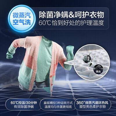 360度微蒸汽循环热风技术,可以抚平衣物褶皱,唤醒衣物活力。90度高温筒自洁设计,保持清新的洗衣环境。