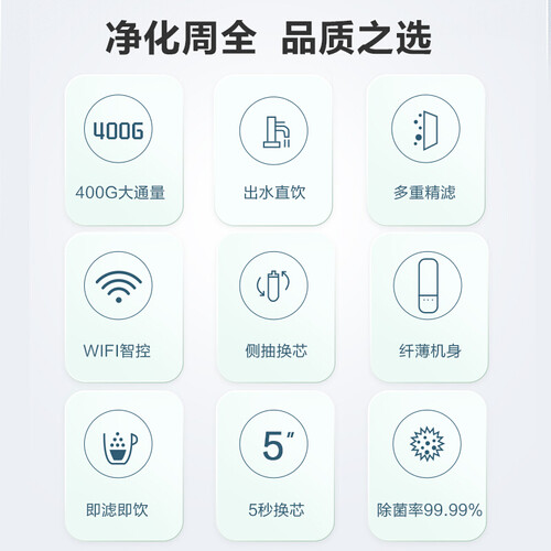 拥有400G大通量,确保出水更快,畅快饮水无需等待。WiFi智能控制的设计,操作更加便捷,实用性更出色。