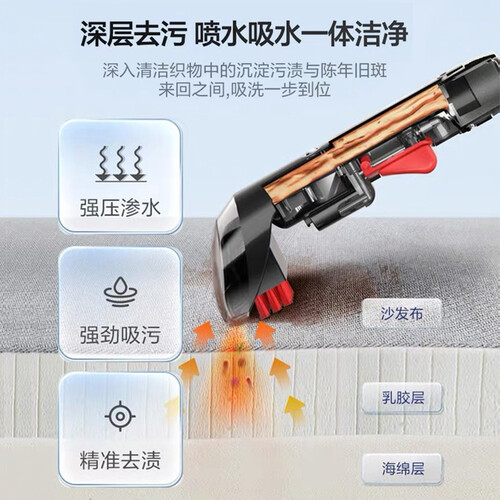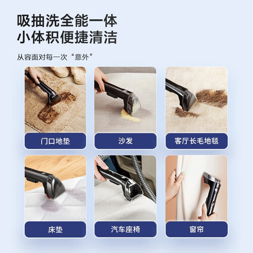 喷抽吸一体设计,轻松清洁各种布艺污渍,污水吸入污水箱,清洁无残留,安全又可靠。小巧机身,易收纳,不占空间。