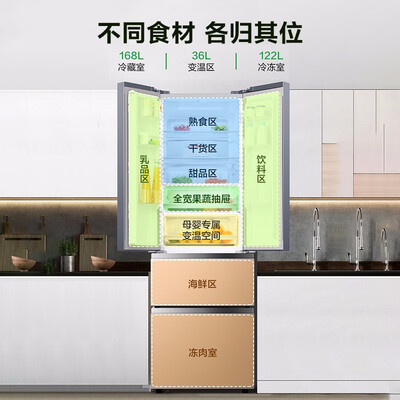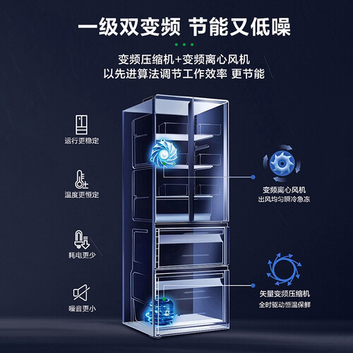 采用三挡变温,配有母婴模式,0℃养鲜和原鲜模式,保护母婴食材。装有蒸发器智能化霜,水汽循环,食材持久鲜润。