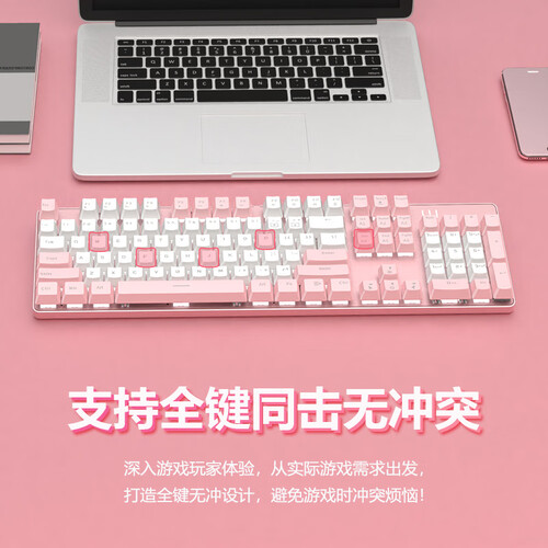 樱花少女粉,融化你的少女心。磨砂触感的凹凸键帽,使用手感非常好。坚固耐用的金属面板延长键盘的使用寿命。