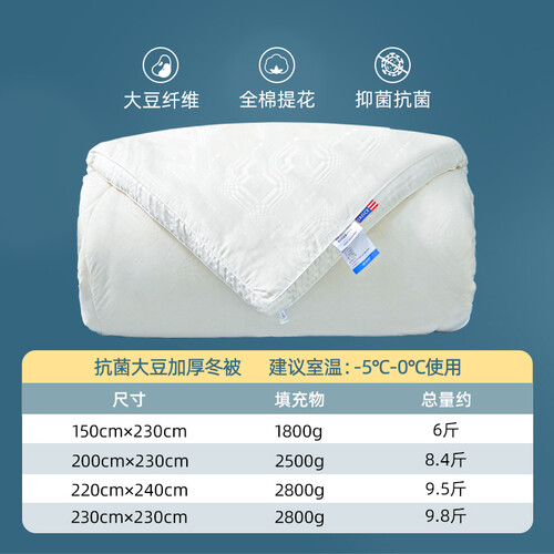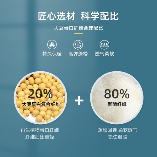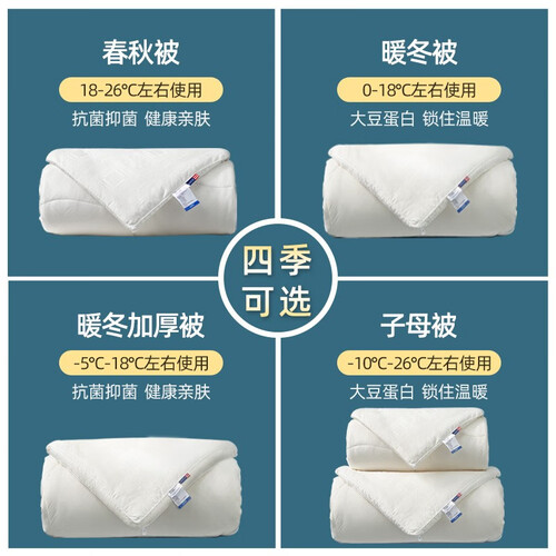 大豆蛋白复合纤维和聚酯纤维混合填充的被芯,柔软蓬松吸湿透气,可快速排除人体产生的湿气,给您带来舒适保暖睡眠。