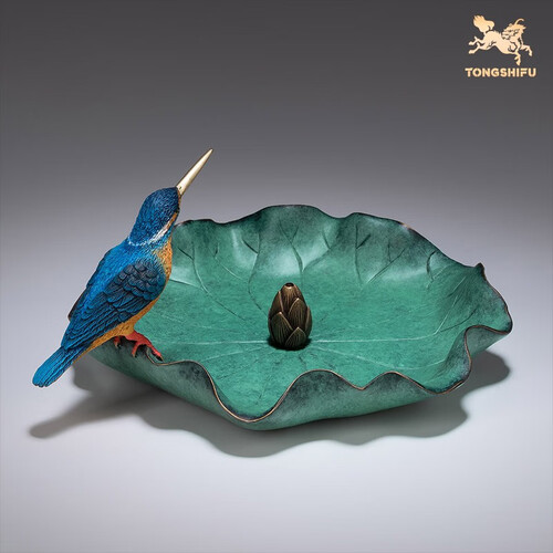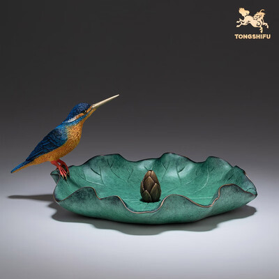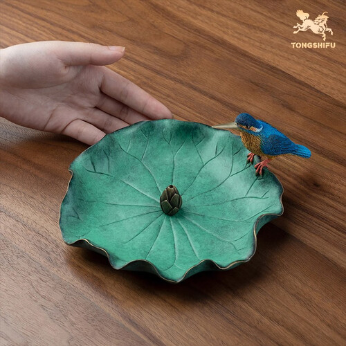 荷叶经过高温着色,呈现如汝窑般的天青色,富有古典美。荷叶上站有一只栩栩如生的小鸟,活灵活现,可爱十足。