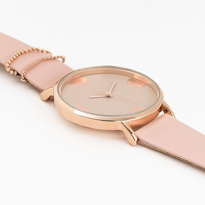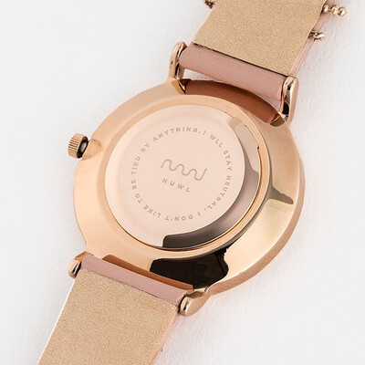采用了金属表框,搭配通体金粉色的设计,时尚不俗气,让您持久使用依旧亮丽。舒适皮质表带,增强透气性能。