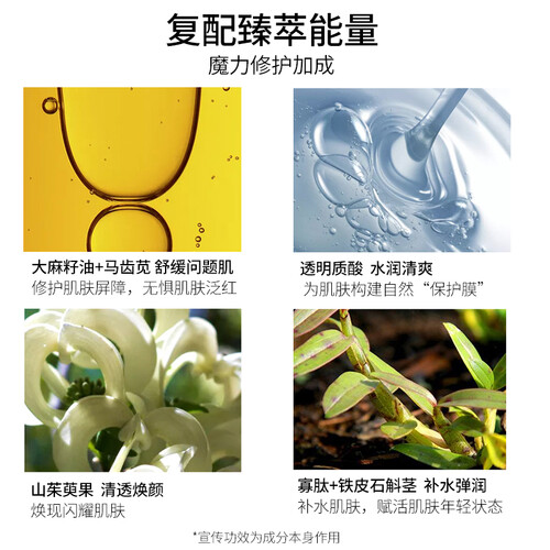 添加大麻叶提取物,修护皮脂膜,改善肌肤泛红干燥等状态。再加上神经酰胺成分,锁水保湿,令肌肤持久水润滋养。