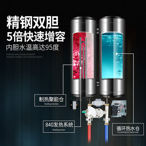 采用精钢双胆设置,提高热水的加热速度,扩充热水加热的面积。搭配通电自检功能,设备通电之后,自动检测是否运行正常。