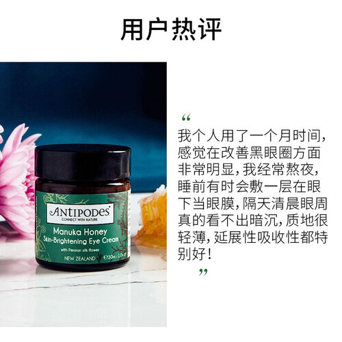 精选麦卢卡蜂蜜,镇静舒缓肌肤,减轻肌肤负担。添加葡萄籽萃取成分,增加肌肤的弹性,紧致眼周,淡化细纹。