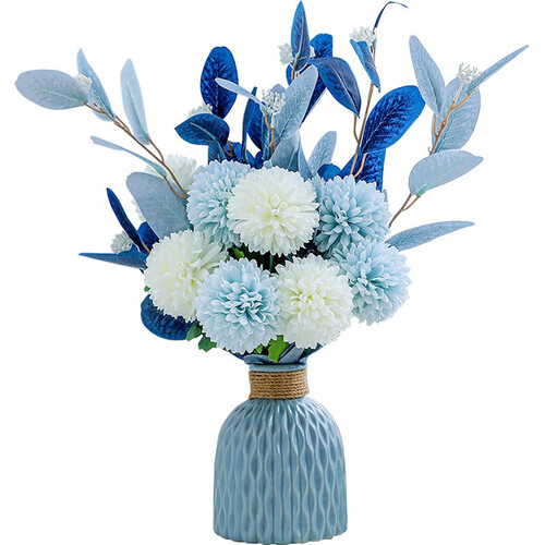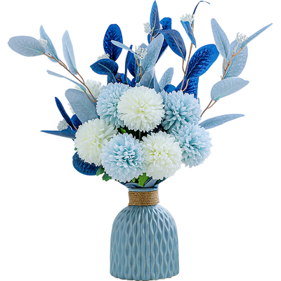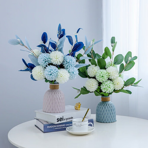 瓶口搭配手工绑绳,看起来造型古朴、别具韵味,加上花瓶的精细纹路,更有美感。手工捆扎的混色花束,富有优雅之风,能彰显格调。