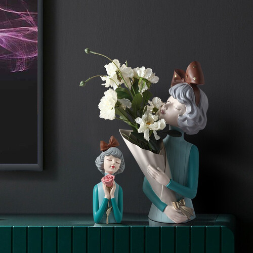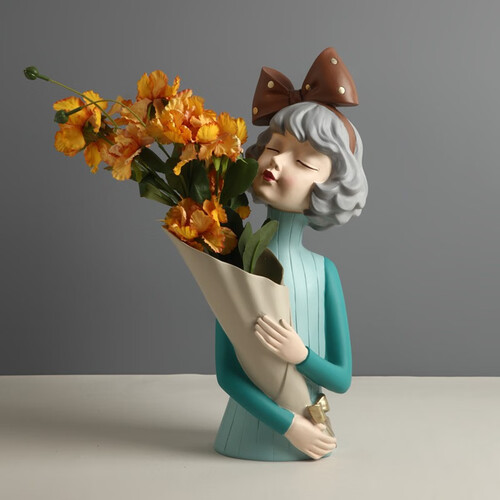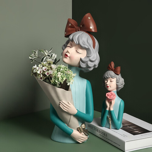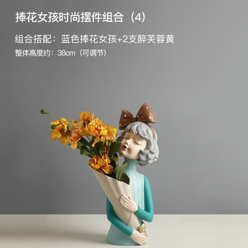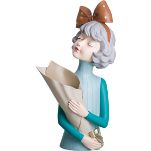 整体颜色以蓝色为主,造型为戴着蝴蝶结捧花的少女,看起来清新又有活力;有着招财纳福的寓意,表达对人们的美好祝愿。
