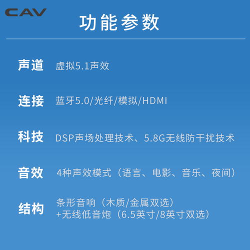 采用5.8GHz的无线连接方式,抗干扰能力强。传输信号更干净,实现纯净的好声音。可以实现立体声环绕音效,身临其境的感受。