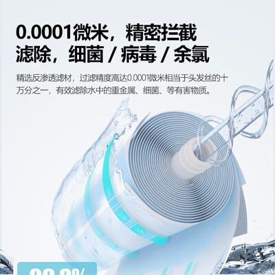 采用反渗透滤材,过滤精度达0.0001微米,带走水中的重金属等有害物质。滤除余氯和铁锈的同时还能保留矿物质。