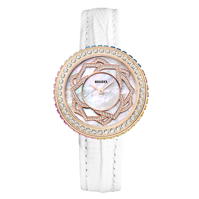 浪漫玫瑰花造型绽放于表盘中央,视效楚楚动人。纤薄表盘设计,可以更好的贴合女性的手腕,打造舒适的佩戴体验。