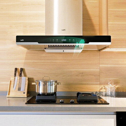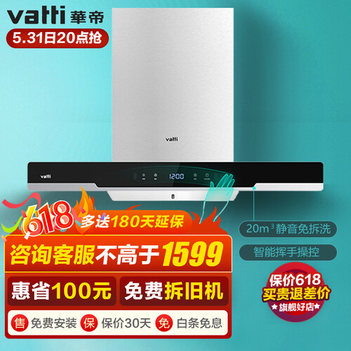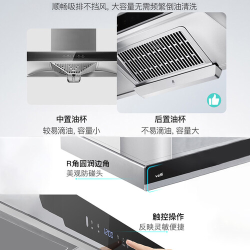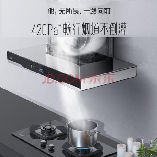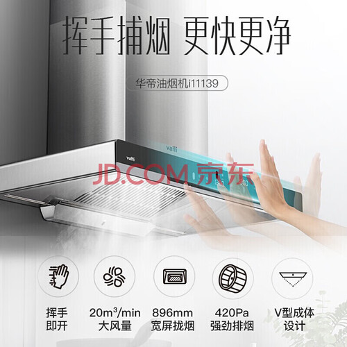 V型成体,黑玻搭配丝印设计,隔空挥手净烟,触控反应也灵敏,宽域锁烟,油烟净化更好,四级风量,应对烹饪百变。