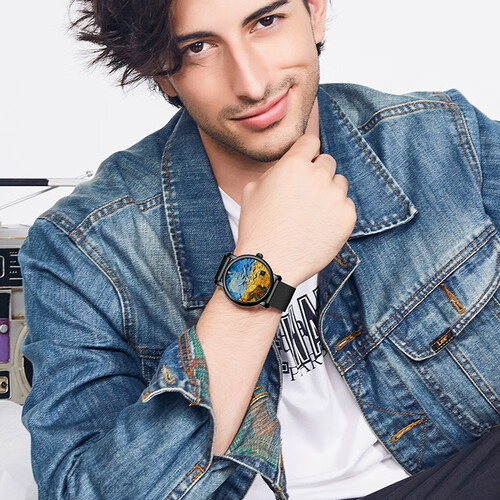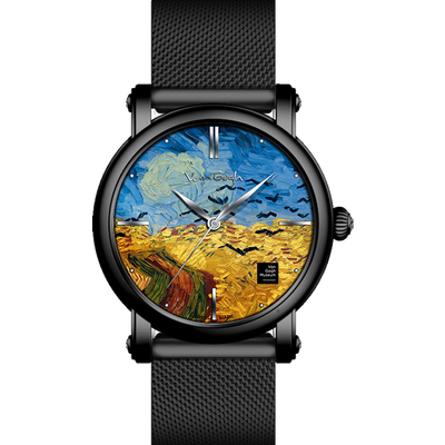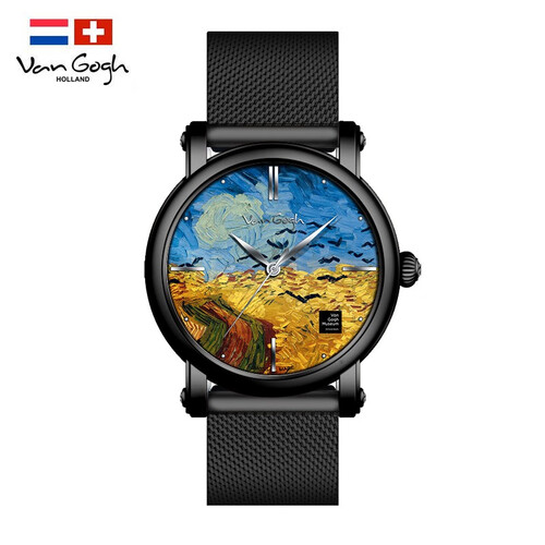 盘面融入梵高的麦田群鸦元素,结合色彩渲染,显得栩栩生动。黑色系表带,耐磨不易脏,方便后期打理。