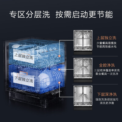 拥有两个喷臂分别按顺时针和逆时针旋转,对餐具的正反面同时冲刷,达到更高的覆盖面积,提升洗净率,大大缩减洗涤时间。