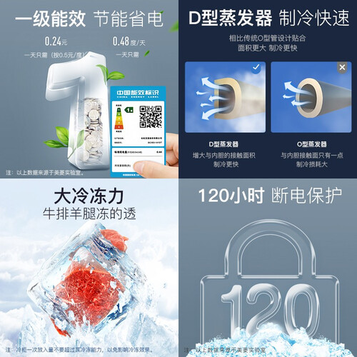 高效压缩机和D行管制冷系统,节能高效,一级能效节能省电。反重力巡航制冷均匀,让食材轻松快速冻透。