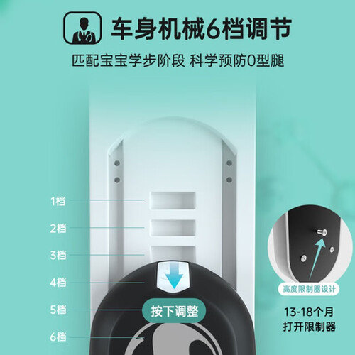 采用纸尿裤专家设计,有效减轻身体重量对腿部的压力,预防O型腿。拥有阻尼轴摩擦轮,能够增加抓地力,限制孩子学步速度。