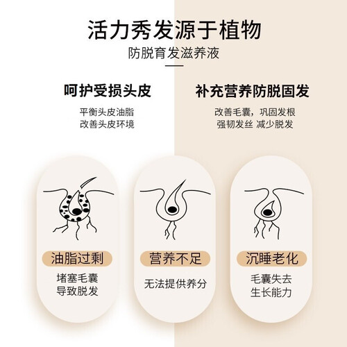 防脱育发的关键在于呵护受损头皮和毛囊,精选8种植物材料,采用低温萃取技术提取活性原液,渗透头皮,呵护毛囊。