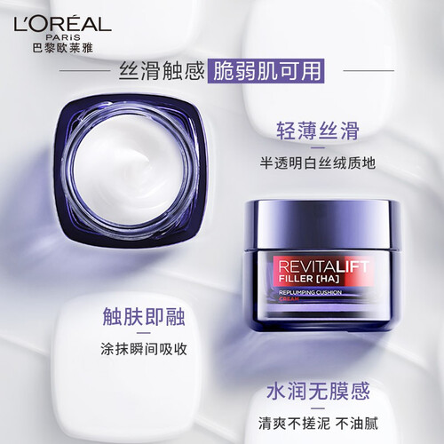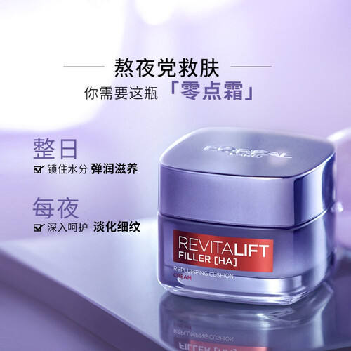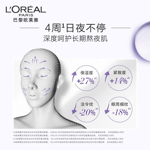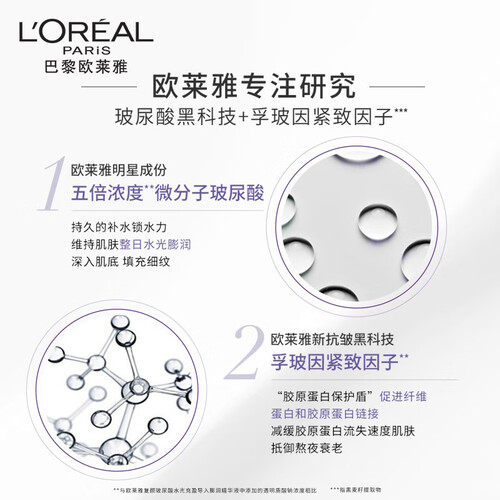 熬夜党救肤专用,利用欧莱雅革新的五倍浓度高浓度微分子、玻尿酸和孚波因紧致因子的力量,维持肌肤水润力同时抵御熬夜衰老速度。