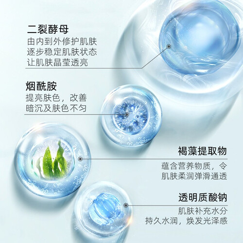 含有透明质酸钠和二裂酵母成分,补充肌肤水分,注入活力,由内到外修护肌肤,水润清爽,打造焕亮水嫩肌。