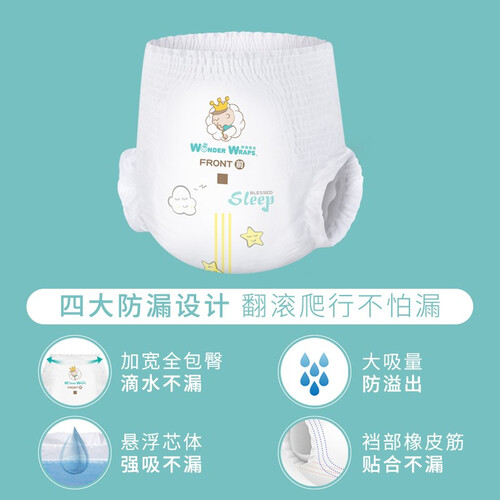 加长的尺寸设计,打造360度全面包裹的结构,宝宝任意翻身也不用担心漏尿;选用魔力SAP高分子,吸收效率加倍。