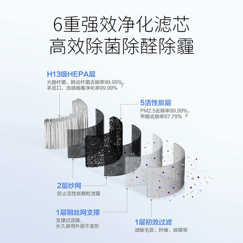 不仅可以净化空气,还可以切换母婴场景,播放助眠音乐以及大自然的声音。内置6层复合滤芯,层层有效过滤,净化空气。