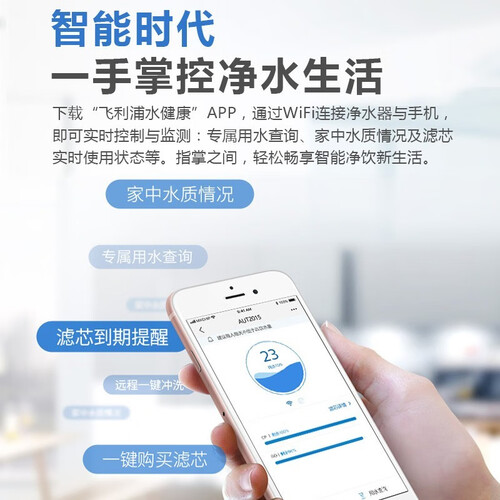 净水器支持通过手机软件智能操控,方便随时使用手机查询水质等。采用一级水效设计,净水器用水更省降低使用成本。