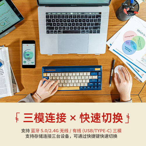 键盘采用了键线分离的设计,并支持蓝牙连接。特别采用低功率耗电技术,可以确保电池的使用寿命和长效续航时间。