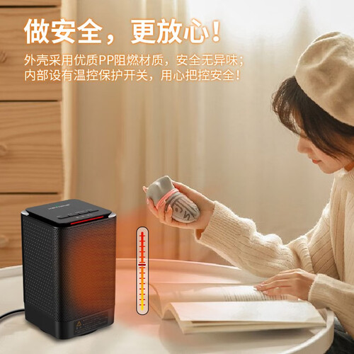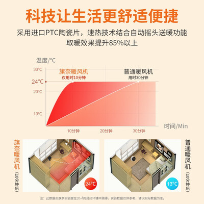采用了进口的PTC陶瓷片,取暖的效果提升了85%以上。具有45度的自动摇头功能,送暖的面积更加的广,使用起来更方便。