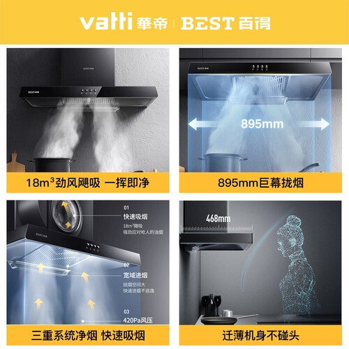 机身的尺寸纤薄美观,安装以后不怕碰头,能够留下充足的操作空间。拥有每分钟18m³的澎湃大吸力,符合国人的烹饪习惯。
