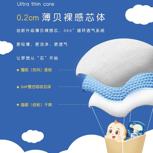 3D丝柔棉感加持,轻柔蓬松,全力为宝宝肌肤健康护航。增加灵敏尿显提示条,方便父母随时观察宝宝状态。