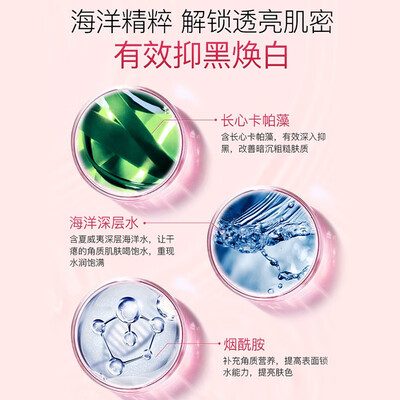 烟酰胺成分,可从肌底净化肌肤,并焕亮暗沉无光的肤色。深海精粹,能够深入淡化痘印及斑点,使肌肤由内而外白皙亮泽。