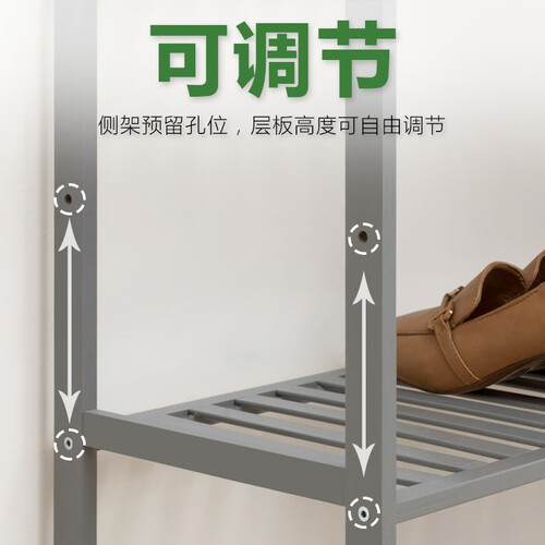 档条排布均匀密实,没有太过宽大的缝隙,搁置物品不会从中坠落;预留孔位,能够自由调节层板,靴子等物品也能畅快放。