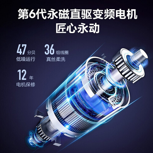 整个电机外壳都采用的全金属材料制成,经久耐用不易损坏。根据衣物重量自动匹配适合的洗涤时间水位转速,高效节能不浪费资源。