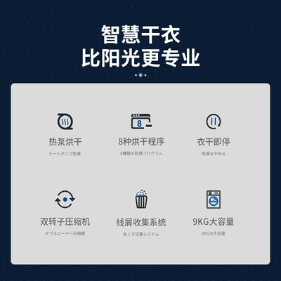 具有衣干即停功能,防止过度烘干对衣物造成损伤。采用稀土永磁压缩机,双转子平衡设计,节能更静音。