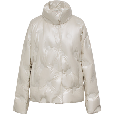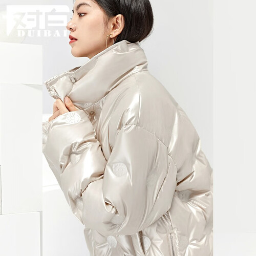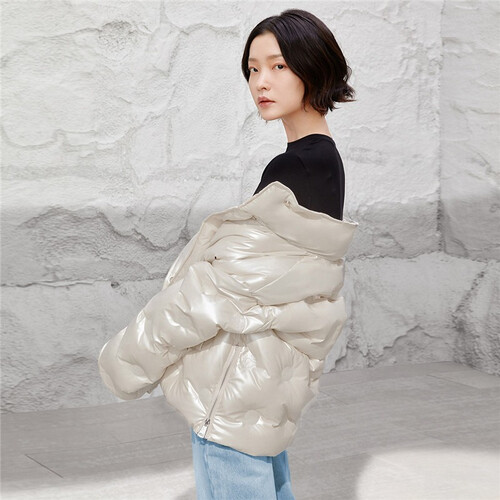 精选经过抗菌科技处理的白鹅绒填充,蓬松保暖,同时减少了细菌繁殖,穿着更加舒适健康。香槟色亮面衣身,穿着温柔时髦。