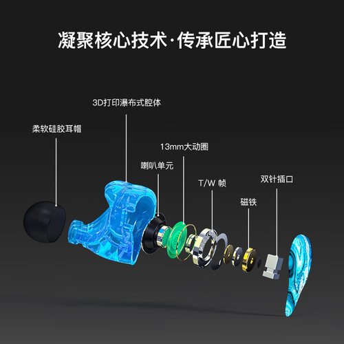 用定制耳机手法打造,舒适3D打印树脂腔体,可换线设计,性能比肩高阶产品。13mm镀钛振膜单元,低音浑厚,人声温润细腻。