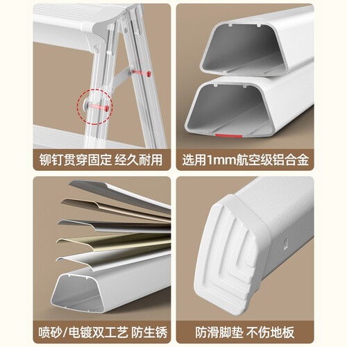 严选加厚航空铝材质,轻盈坚固,防潮防锈,安全耐用。设有防滑脚垫,稳定牢固,抓地力强,安全攀登。