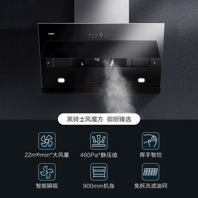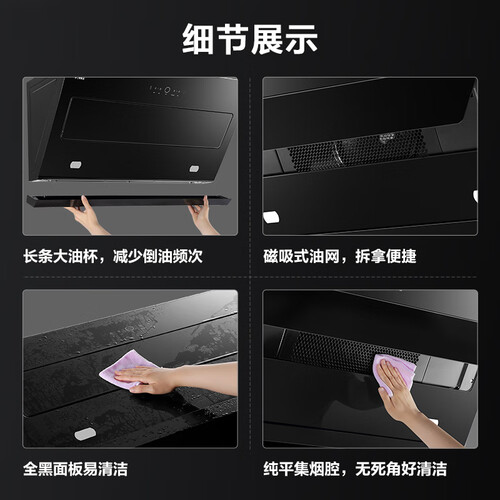 黑晶钢化玻璃面板,光滑平整,附着的脏污一擦即净,家务简单省力。风机下置设计,靠近烟源,提高排烟效率。